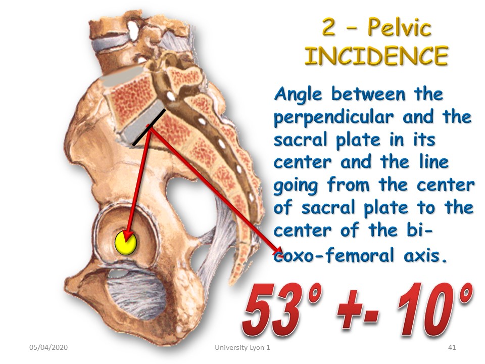 Pelvic incidence is defined by the angle formed by the perpendicular to the centre of the plateau of S1 and the line joining the centre of the acetabulum. This angle is constitutional and is not modified by the pelvic version. It is equal to the sum of the inclination of the sacral slope to the horizontal (37°) + the pelvic version (16°). In case of normal incidence all defects can be corrected. If it is pathological, it will have to be compensated by adapting the sitting position. During the growth period, treatment with a brace can slightly modify this angle. |