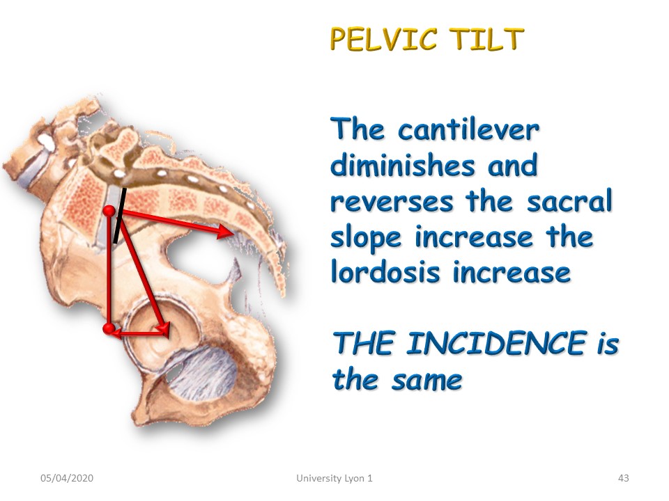 On the contrary, pelvic retroversion moves the L5-S1 disc away from the centre of the femoral head, decreasing the inclination of the sacral slope to the horizontal and lordosis. The pelvic incidence remains the same. |