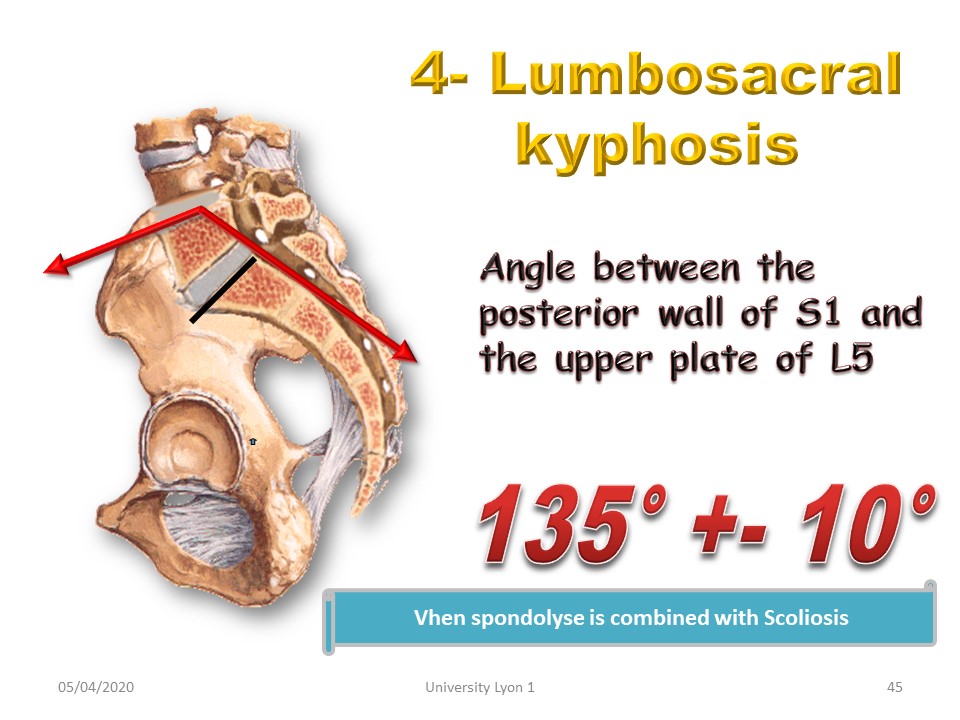 20% of lumbar scoliosis is associated with spondylolisthesis. The evolutionary prognosis is determined by lumbo-sacral kyphosis: 135° = Normal and 110° = brace, 90° = surgical discussion. |