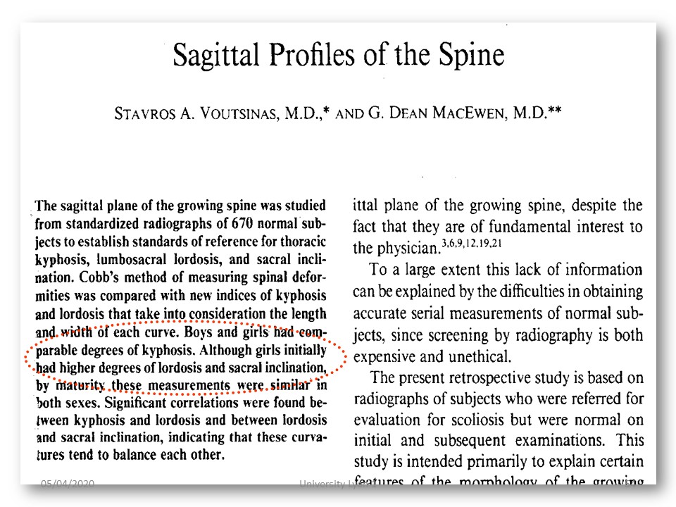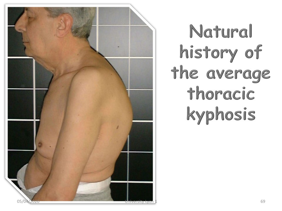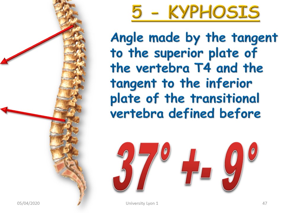 Another difficulty comes from the fact that, unlike scoliosis, kyphosis is physiological. One of the first researches was therefore to define the limits of physiological and pathological by a morphostatic study published in 1982. Taking T4 as the upper limit vertebra, the average angulation is 37°. |