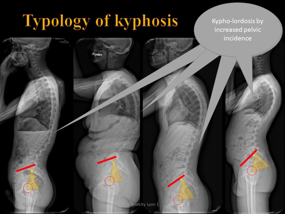 Typology of kyphosis may vary with pelvic incidence. 1. Low incidence promotes thoraco-lumbar kyphosis. 1. Low incidence promotes thoraco-lumbar kyphosis with flat back 2. or extension of thoracic kyphosis. 3. Normal incidence with thoracic kyphosis and hypolordosis. 4. Kypho-lordosis by increased pelvic incidence. |