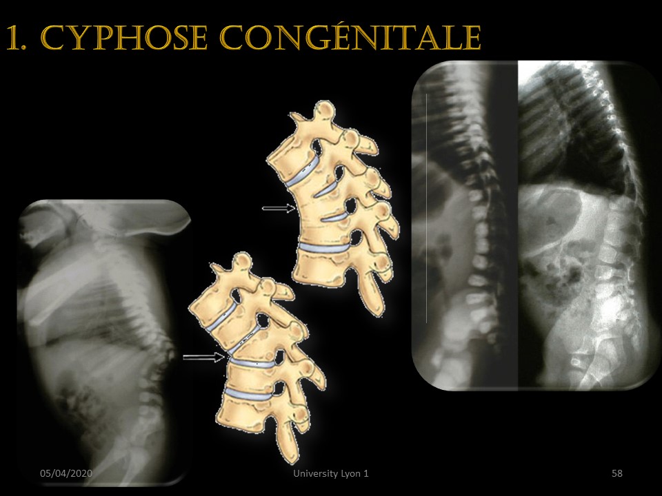 In infants, the existence of a kyphosis, most often angular, is a congenital vertebral malformation that can be either an anterior block or a corporeal agenesis. |