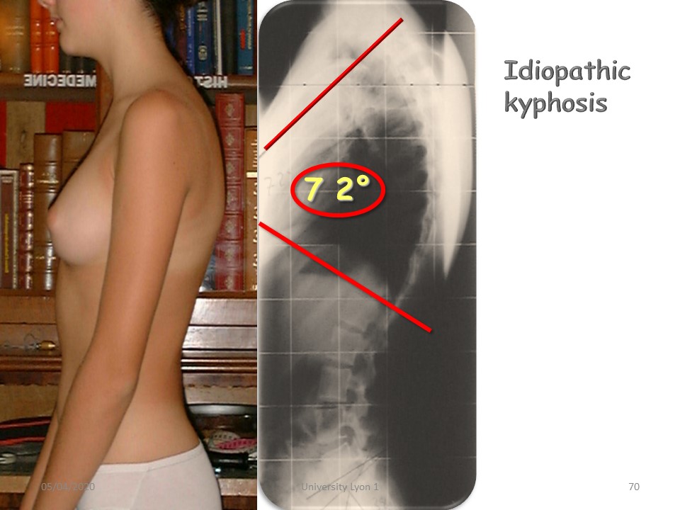 Similarly, unlike scoliosis, kyphosis due to Scheuermann's disease accounts for almost half of the patients. When the radiological lesions are minimal, we speak of idiopathic kyphosis. |