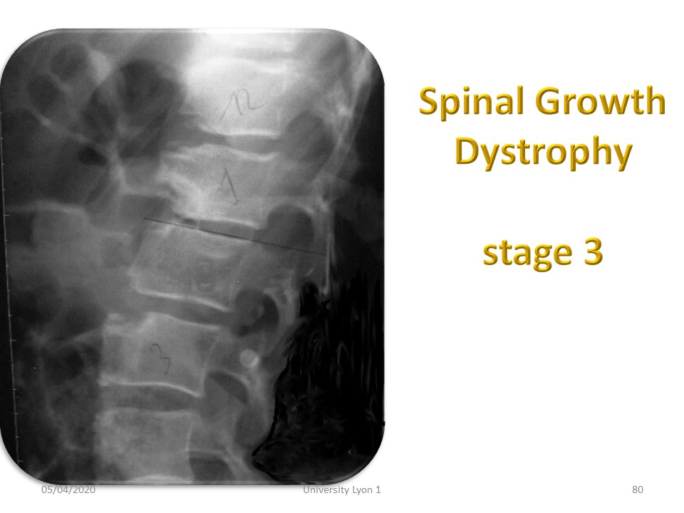Spinal Growth Dystrophy stage 3, with significant and diffuse alteration on several vertebral bodies. The anterior wall is very dystrophic. |