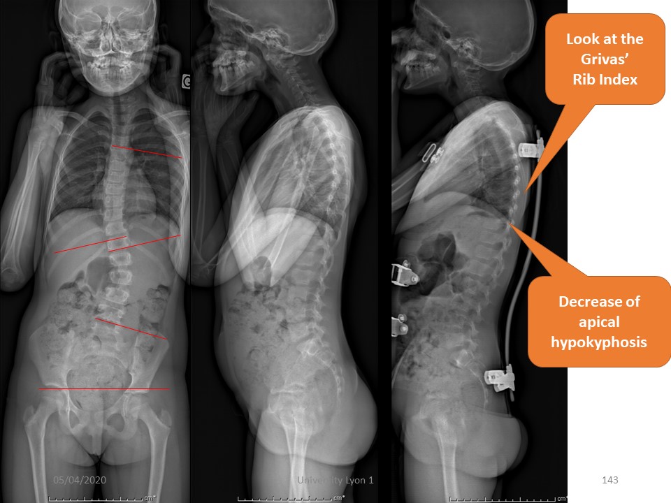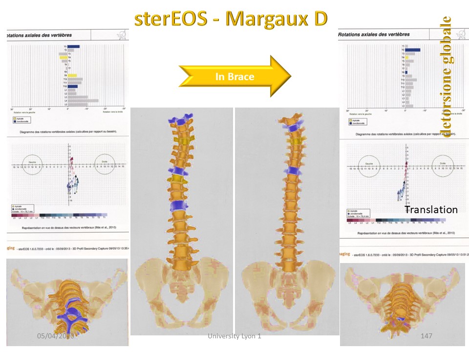 This correction in the frontal plane and in the sagittal plane is associated with a refocusing of the vertebral bodies on the line of gravity, clearly visible on this "Da Vinci view". |