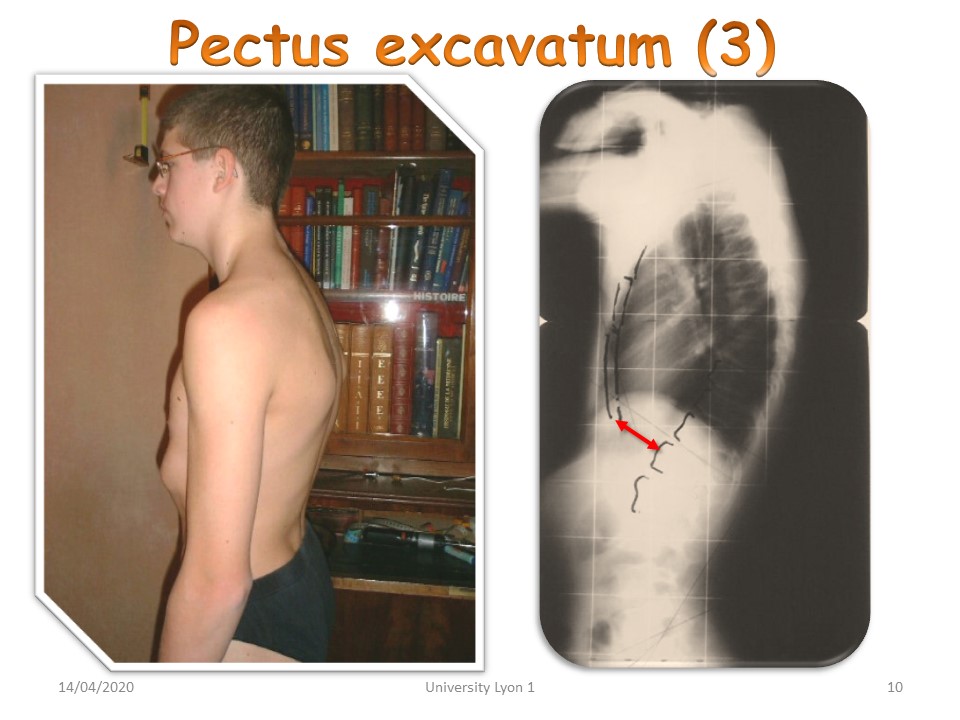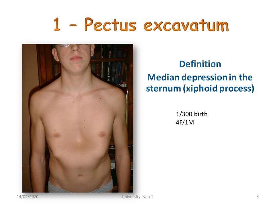 One of the most frequent (1/300) is the pectus excavatum with median depression of the sternum at the level of the xyphoid appendix. It concerns 4 girls for 1 boy. |