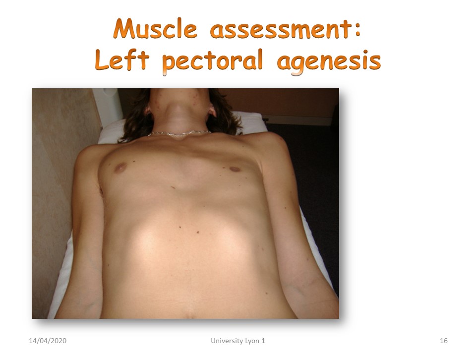 The asymmetry is not always bony, it can also be muscular with pectoralis agenesis. We'll look for other deformities in the context of Poland Syndrome. |