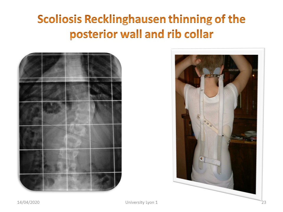 Scoliosis involves a thinning of the posterior wall of the vertebral body and the neck of the ribs, the embryology of which is derived from the ectoderm. This narrowing widens the medullary canal and avoids neurological complications. The posterior arch remains intact, which limits extension. The curvatures are short and make fitting difficult. |