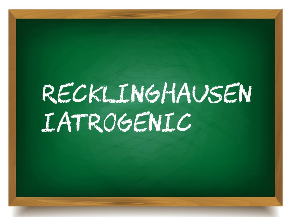 Recklinghausen's disease is a phacomatosis and affects tissues derived from the ectoderm. The presence of more than 7 café au lait spots is characteristic, Thoracic deformities associated with scoliosis are often greater than in idiopathic scoliosis. |