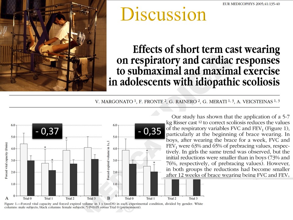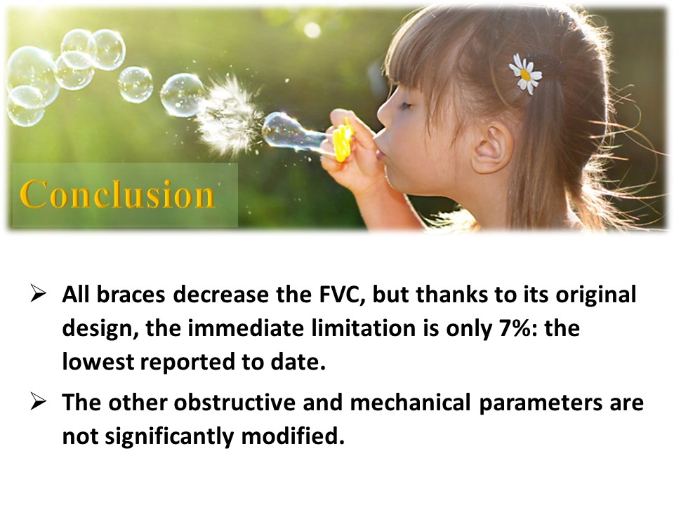 All braces decrease the FVC, but thanks to its original design, the immediate limitation is only 7%: the lowest reported to date. The other obstructive and mechanical parameters are not significantly modified. |