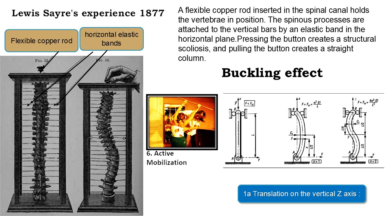 originates from 1877. In his method, a bendable copper rod is placed into the spinal canal, acting as a central axis to maintain the alignment of the vertebrae. The spinous processes are secured to the sides with a rubber band in the horizontal plane. When the button is pressed, it induces a structural scoliosis, while pulling the button restores a straight spinal column. Thus, the horizontal plane and vertical axis are crucial in forming and correcting scoliosis. |