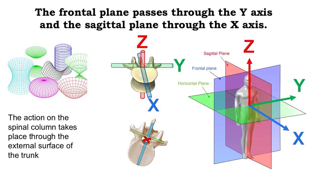 The movement between two vertebrae takes place along 3 axes: 2 horizontal; transverse (joining the transverse processes) and sagittal (in the axis of the spinous process) and 1 vertical (in the axis of the spinal cord), The intervertebral movement therefore has 6 degrees of freedom at each of the 17 thoracic and lumbar levels . |