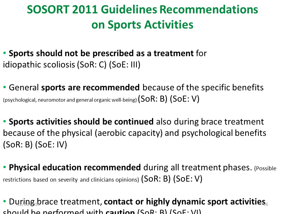 The SOSORT guidelines concerning the practice of sport are clear. Sport is not a treatment for scoliosis, the practice of sport is recommended, the practice of a sport should not be interrupted by treatment except during the total time period when the wearing of the brace is incompatible with sport practice.