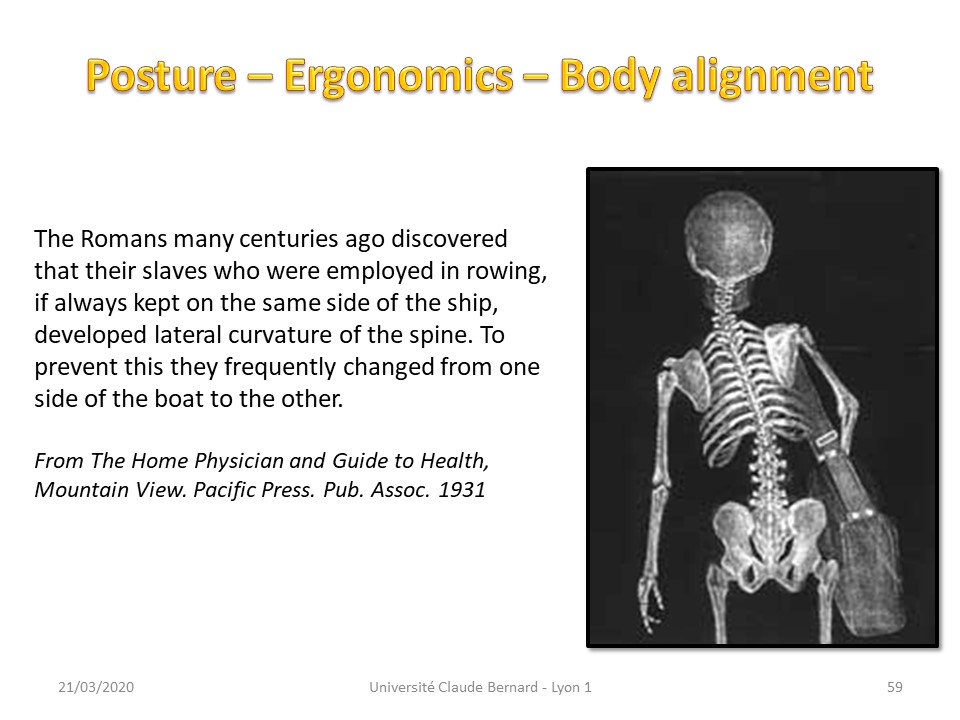 Wearing an asymmetric load on the shoulder will create a compensatory, homolateral attitude with contralateral misalignment of the occipital axis which will rebalance the loads at the apical vertebra. A second compensation takes place at the cervical level, because the vestibular system and the head must remain horizontal. As on the Roman galleys, the precautionary principle justifies alternating the load sometimes to the right and sometimes to the left, as we do spontaneously for a heavy load.