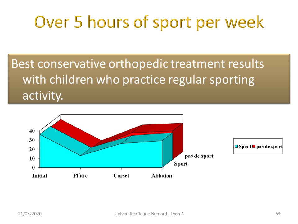 During the statistical evaluation of treatments by the Lyon brace, we isolated the patients practicing more than 5 hours of sport per week and compared the results with those of the general statistics. The results are significantly better with sport activity.