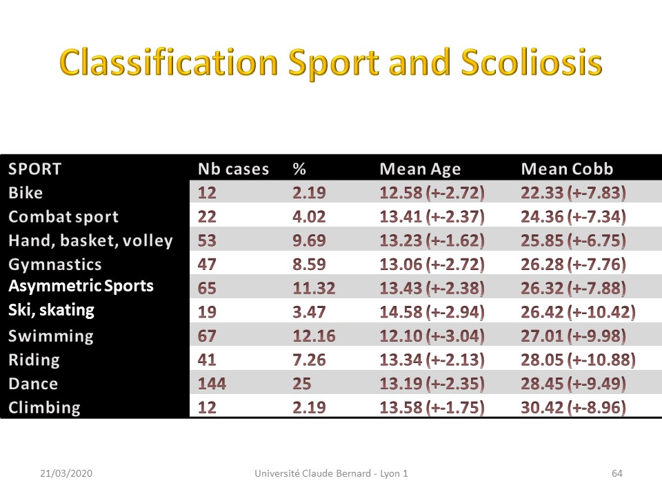 Parents often ask the question of the best sport to practice in scoliosis. It is difficult to statistically compare different sports. The only indication is the average initial angulation of scoliosis at the first specialized examination. If we admit that low initial angulation is a factor in the success of orthopaedic treatment, cycling and combat sports would be advisable.