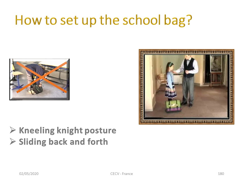 During school time physiotherapy can be done with the school bag, which allows to teach the child some rudiments of ergonomics. The school bag represents the knowledge of the child and in Europe the weight of science has no limit. The standing position, trunk bent at 90 ° is to be avoided. Knight's kneeling position is preferable. The child slides the school bag, soil on his knees Then in a second time, fixed on the shoulders through a rotation back and forth.