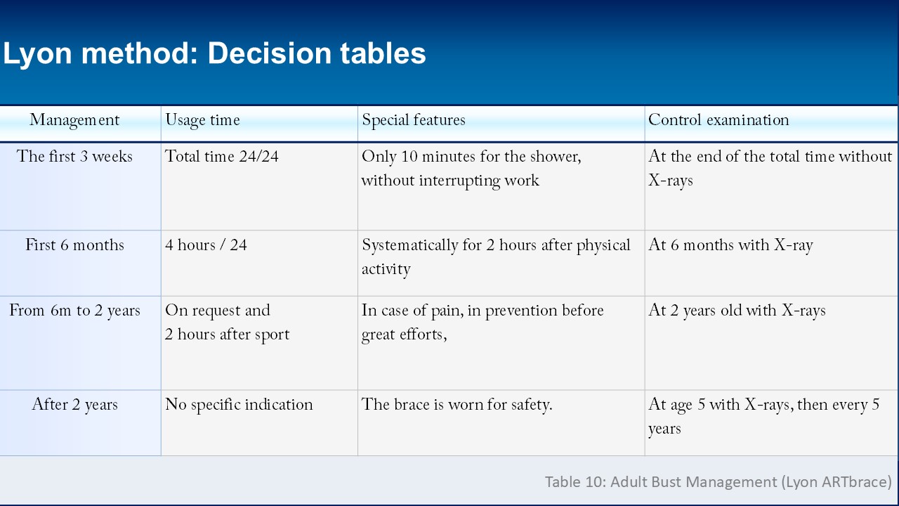 In instances where the use of a brace is recommended, the Lyon method distinguishes between full-time and part-time usage. Full-time brace wear replaces the previous period of plaster casting and is essential for inducing plastic deformation in the paravertebral ligament structures. The duration of full-time wear can range from one to four months, contingent upon the initial Cobb angle. Similarly, the initial prescription for part-time brace wear is based on the Cobb angulation, with further adjustments made according to the curvature's reducibility and elasticity. Reducibility is defined as the variation between the initial angulation and the angulation experienced while wearing the brace, typically averaging at 70% for the ARTbrace. When a curvature displays lower reducibility, this suggests a greater rigidity, thereby requiring an extension in partial wearing time. Elasticity, on the other hand, is calculated as the difference between the in-brace angle and the angle observed after at least one hour without the brace. On average, elasticity is recorded at 12°. Should the elasticity exceed 12°, an increase in the duration of brace wear may be warranted.