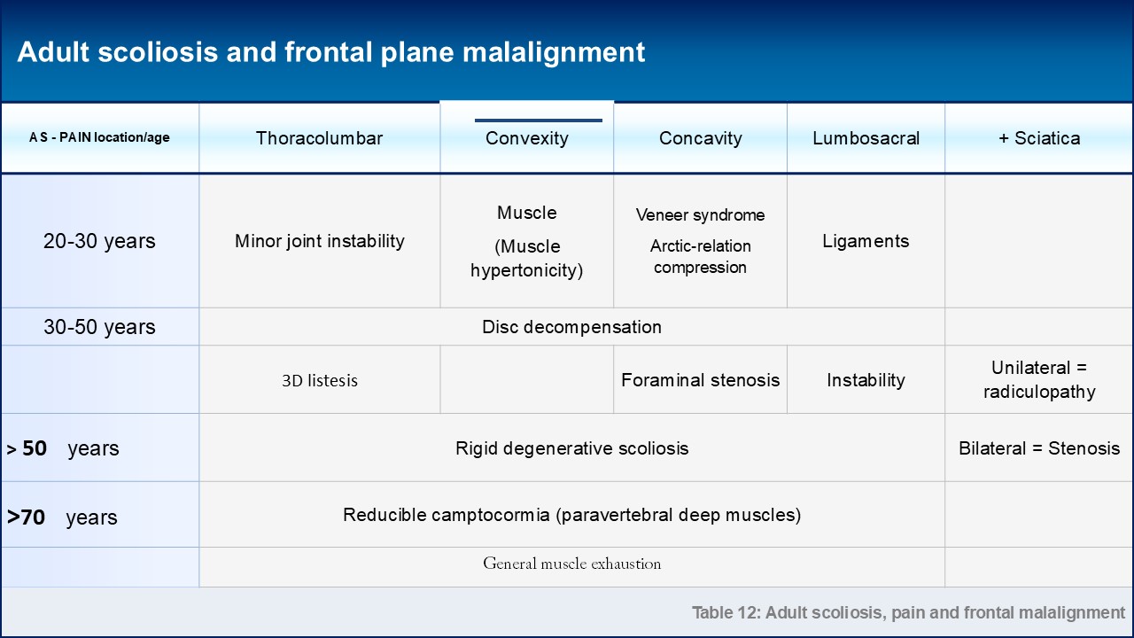 When assessing adult scoliosis, the age of the patient at the initial consultation serves as a crucial indicator of the scoliosis type. For individuals under the age of 50, scoliosis often represents the progression of adolescent scoliosis. Conversely, beyond the age of 50, de novo scoliosis tends to be more prevalent. Once a patient reaches the age of 70, significant imbalances, such as camptocormia or Pisa syndrome, may necessitate the use of a walker. Our analysis has categorized pain based on age and its location within the body. The progression of angular deviation can be mitigated by core exercises conducted in both the frontal and sagittal planes. Engaging in fitness routines that bolster the abdominals and gluteal muscles promotes pelvic retroversion, while physiotherapy targeting the quadriceps rectus femoris enhances anteversion. It is advisable to refrain from sports activities that induce lordosis, and instead, focus on adjusting one's sitting posture at a computer to minimize strain. Osteoporotic high thoracic kyphosis can lead to a forward shift in the center of gravity. Therefore, exercises should be practiced in a closed kinetic chain, with the hips flexed at a 90-degree angle.