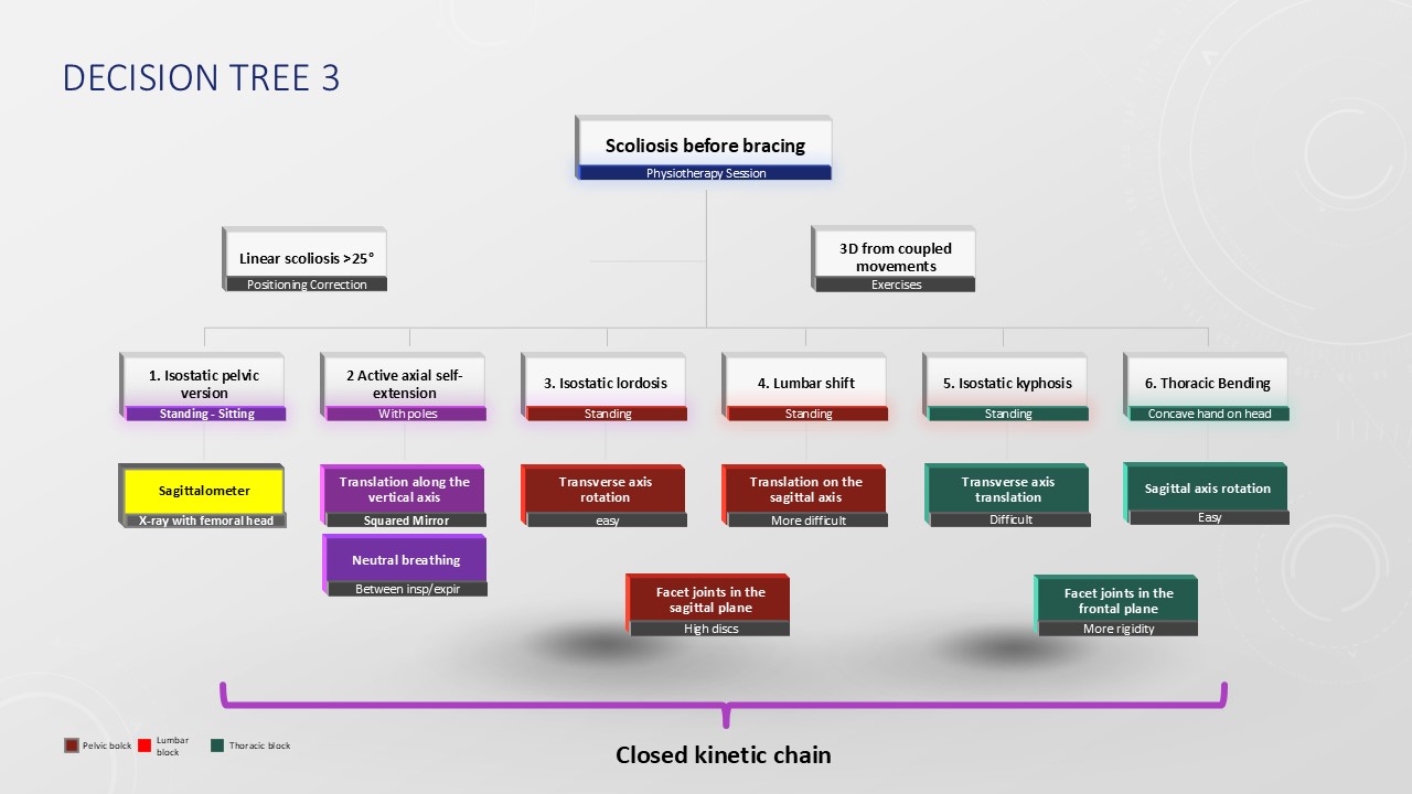 In the Lyon Method, scoliosis physiotherapy is complementary to brace therapy. For angulations of less than 20°, it is limited to stimulating the extrapyramidal postural system via its 4 tracts. It is adapted to the maturation stage of the postural system. When the angulation exceeds 25°, mechanical scoliosis correction exercises must complement basic physiotherapy. As with braces, these are performed using detorsion. Geometrical detorsion using axial elongation (exercise 6) and mechanical detorsion using coupled movements in the frontal and sagittal planes (exercise 7 & 8). The aim is to prepare the 3 corrections for moulding the ARTbrace. During full time, the emphasis is on exercises 9 & 10 with “grand porter” and ballistic stretching. During part-time treatment, physiotherapy is usually performed without the brace, and exercise 11 will check that the corrected position is maintained during imbalances. When the brace is removed, the emphasis is on exercise 12, which strengthens the axial muscles. To promote bone mass, sporting activities with axial impact encourage calcium fixation on the vertebral body.