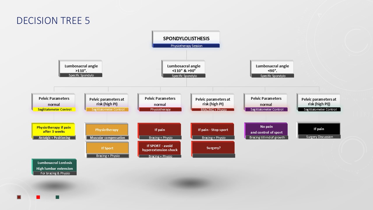 Spondylolysis, which affects approximately 7% of the Caucasian population, is linked to 20% of cases of lumbar scoliosis. Meanwhile, spondylolisthesis is present in 2% of population found in academic publications. Importantly, this condition is never congenital. The lumbosacral angle stands out as a vital predictive factor; when this angle exceeds 110°, the outlook is generally positive. In such scenarios, wearing a brace during the growth phase is only recommended if persistent pain is not alleviated by physiotherapy. For individuals with a high pelvic incidence, it is advisable to refrain from participating in sports that involve hyperextension. Conversely, if the lumbosacral angle ranges between 90° and 110°, the sacrum tends to verticalize, increasing the risk of condition progression. Although lumbosacral parameters might appear normal in these cases, activities involving hyperextension shocks must be strictly avoided. An increased pelvic incidence accompanied by pain necessitates conservative orthopedic management during growth. Should the lumbosacral angle fall below 90°, a significant risk of progression exists, warranting the obligatory use of a brace throughout the growth period.