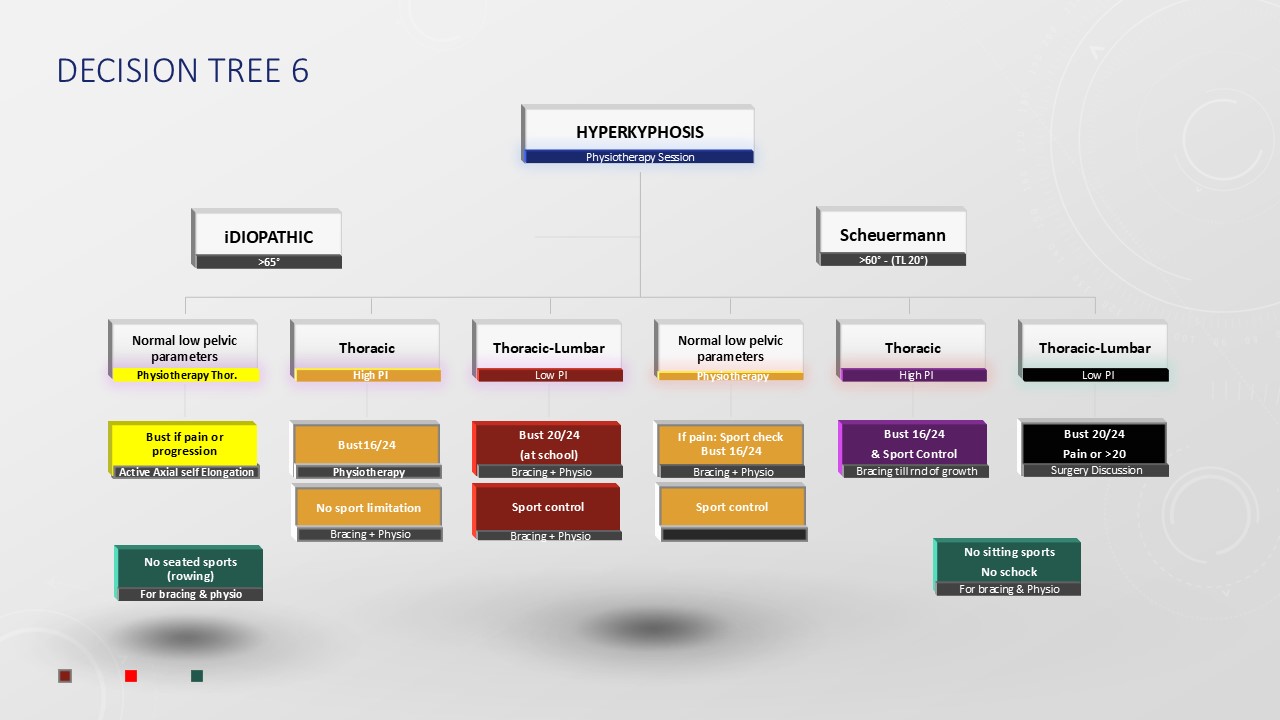 Thoracic Hyperkyphosis is a condition that is less prevalent than idiopathic scoliosis. Typically, it becomes painful when associated with Scheuermann’s disease. Like scoliosis, it can also present as idiopathic. Although lumbopelvic parameters are examined, their correlation with pelvic incidence holds less significance compared to lordosis. When these parameters are within normal limits, physiotherapy is usually sufficient to manage pain, thanks to the viscoplastic properties of the fascia attaching to the posterior arch and the common anterior vertebral ligament. A medium thoracic kyphosis often correlates with a high pelvic incidence, while a thoracolumbar location tends to indicate a lower incidence. In such circumstances, there might be a need for an ergonomic seat adjustment. In cases involving Scheuermann’s disease, the presence of rigidity with partial reducibility during the extension test may require the implementation of a brace. This is particularly important until the completion of growth, especially in instances of a thoracolumbar form. The protocol for using the brace will be tailored to the specific degree of kyphosis and rigidity present.