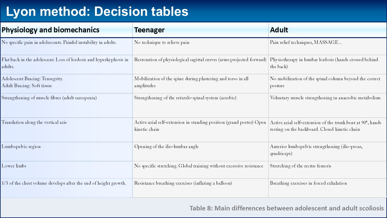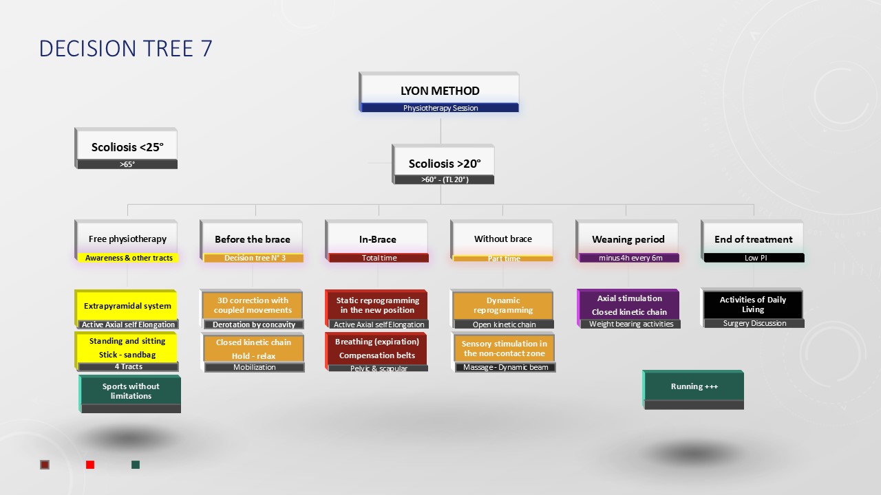For over two hundred years, the Lyon method has been a harmonious blend of bracing and physiotherapeutic techniques aimed at halting the progression of scoliosis and thus reducing the necessity for surgical intervention. In cases of idiopathic scoliosis, the therapeutic strategy emerges from a multitude of compromises, primarily influenced by the degree of spinal curvature, the specific area of the spine affected, and the age of the patient. This strategy is not only the culmination of extensive experience but also is supported by evidence derived from successful outcomes. While inevitable adjustments must be made in response to advancements in technology and shifts in the environment, these modifications remain relatively minor. The fundamental principles of the approach have been derived from the SOSORT guidelines.
