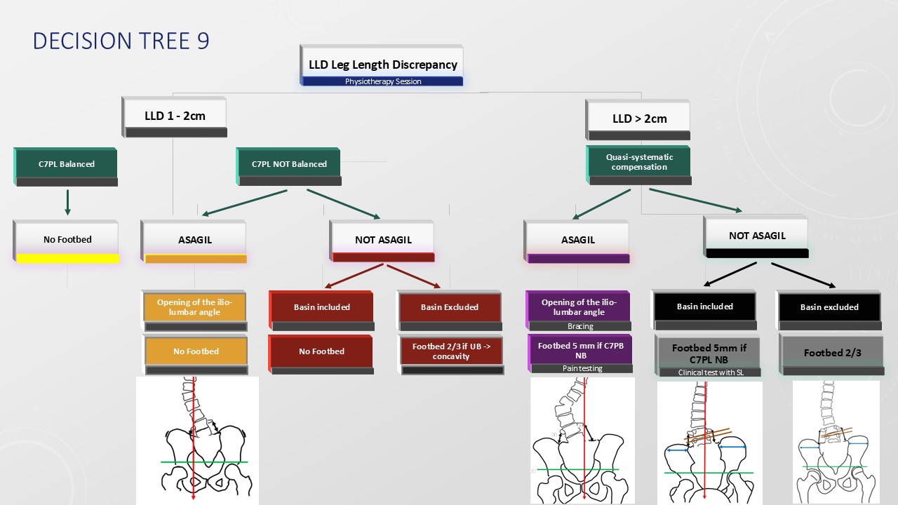 During the era when poliomyelitic scoliosis was prevalent, it was common to observe pelvic imbalance caused by a disparity in the lengths of the lower limbs. At that time, surgical procedures such as epiphysiodesis and limb lengthening were more frequently indicated. In contemporary practice, a routine recommendation is to employ a two-thirds compensation approach for limb length discrepancies exceeding 2 centimeters but not surpassing 4 centimeters, utilizing insole within the shoe and heel lifts. Should the discrepancy be less than 1 centimeter, no corrective measures are advised. For differences between 1 and 2 centimeters, compensation is not recommended prior to the pubertal growth spurt, as early intervention might hinder the body's natural ability to adjust, given that the growth plate on the shorter side is likely to be more active. During puberty, it is important to assess whether compensatory measures alleviate any curvature observed during the Adams forward bend test or correct potential frontal imbalances of the occipital axis. In cases where there is a tilt of the L4 vertebra, it is advisable to employ minimal compensation to facilitate the widening of the ilio-lumbar angle, particularly when the pelvis is already inclined.
